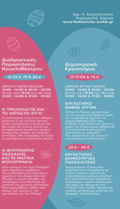 Επισκεφθείτε τα καταστήματά του Fashion City Outlet, κάντε τις αγορές σας ανάμεσα από μία τεράστια ποικιλία προϊόντων και διασκεδάστε στον υπέροχο Λουλουδένιο Πασχαλόκηπο με δημιουργικά εργαστήρια και διαδραστικές παραστάσεις για μικρούς και μεγάλους.