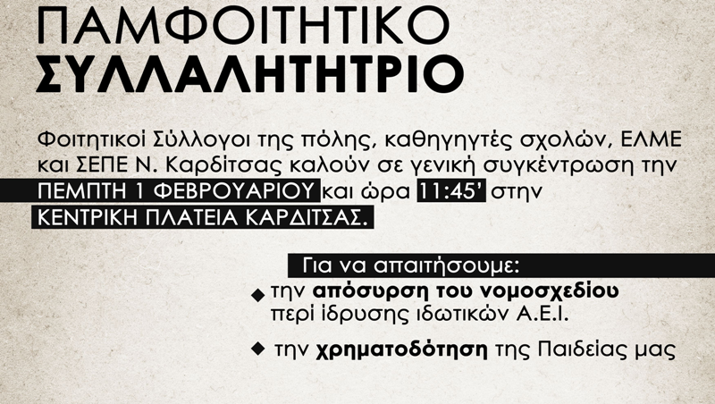 Ενάντια στα σχέδια της κυβέρνησης για δημιουργία ιδιωτικών πανεπιστημίων, οι φοιτητές συνεχίζουμε τον αγώνα μας. Μαζί με καθηγητές των σχολών, την ΕΛΜΕ και τον ΣΕΠΕ Ν. Καρδίτσας κάνουμε ανοιχτό κάλεσμα στον λαό της Καρδίτσας (φορείς, συλλόγους, μαθητές, απλό κόσμο) για συγκέντρωση στην Κεντρική πλατεία Καρδίτσας την Πέμπτη 1 Φεβρουαρίου, ώρα 11:45′!