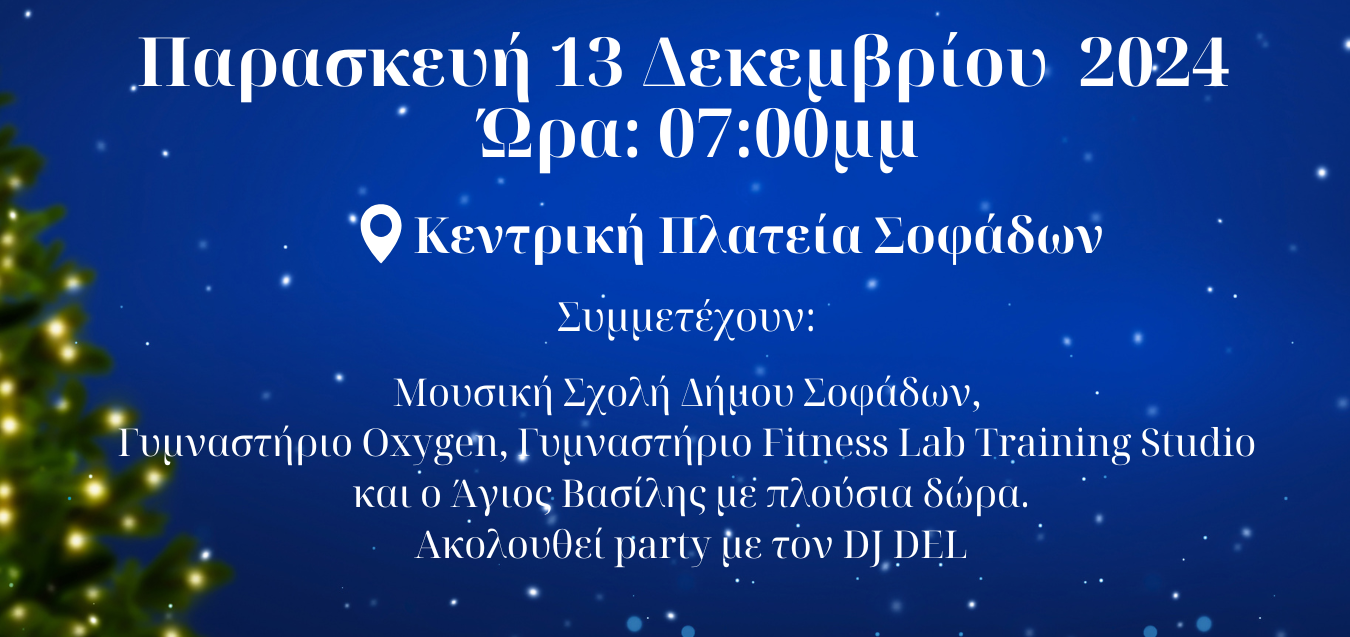 Ο  Δήμος Σοφάδων προσκαλεί τους δημότες και τους επισκέπτες  να φωταγωγήσουν όλοι μαζί το Χριστουγεννιάτικο Δέντρο και να γεμίσουν  την πόλη με αγάπη, φως και γιορτινή διάθεση.