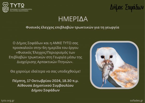 Η «Οργάνωση για τη Διαχείριση και Διατήρηση της Βιοποικιλότητας στα Αγροτικά Οικοσυστήματα – ΤΥΤΩ» θα ενημερώσει τους παρευρισκόμενους για το πρόγραμμα «Φυσικός Έλεγχος / Περιορισμός των Επιβλαβών τρωκτικών στη Γεωργία μέσω της Διαχείρισης Αρπακτικών Πτηνών» που υλοποιείται σε συνεργασία με την Περιφέρεια Θεσσαλίας σε 9 Δήμους της περιοχής μας.