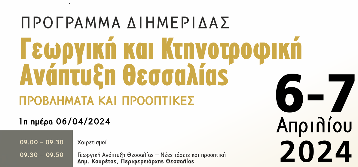 Η Περιφέρεια Θεσσαλίας και το Περιφερειακό Συμβούλιο Έρευνας και Καινοτομίας διοργανώνουν διημερίδα στη αίθουσα του Περιφερειακού Συμβουλίου (Καλλισθένους & Θεοφράστου) με θέμα: «Γεωργική και Κτηνοτροφική Ανάπτυξη Θεσσαλίας-Προβλήματα-Προοπτικές» στις 6 και 7 Απριλίου 2024. Στη διημερίδα συμμετέχουν εκπρόσωποι των παραγωγικών φορέων της Θεσσαλίας και καθηγητές του Πανεπιστημίου Θεσσαλίας. Η διημερίδα διοργανώνεται στον απόηχο της δημόσιας διαβούλευσης της πρότασης της Ολλανδικής εταιρείας HVA International που αφορά στην προστασία της περιοχής και της αγροτικής παραγωγής από τις πλημμύρες και την ξηρασία.