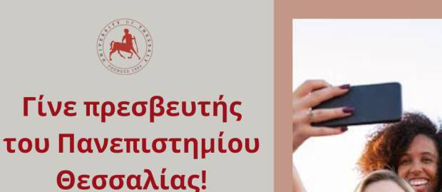 Είσαι φοιτητής/τρια του Πανεπιστημίου Θεσσαλίας και θέλεις να μοιραστείς την εμπειρία σου; Είσαι εξοικειωμένος με τα μέσα κοινωνικής δικτύωσης; Τότε σε ψάχνουμε! Δημιουργούμε το Πρόγραμμα «Γίνε Πρεσβευτής» του Πανεπιστημίου Θεσσαλίας και τώρα μπορείς να συμμετέχεις.
