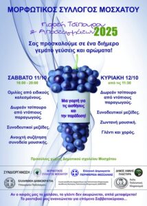 Γιορτή Τσίπουρου & Αποσταγμάτων στο Μοσχάτο, στον προαύλιο χώρο του Δημοτικού Σχολείου το Σάββατο 11 Οκτωβρίου 2025 μεταξύ 16:00 έως 20:00 & την Κυριακή 12 Οκτωβρίου 2025 στις 11:30.