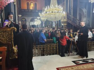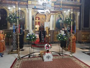 Ιδιαίτερα κατανυκτική στιγμή αποτέλεσε η εκτέλεση της ψαλμωδίας «Σήμερον Κρεμάται επί ξύλου» από την 40μελή Μικτή Χορωδία του Ωδείου Καρδίτσας «Κωνσταντίνος Ευθυμιάδης», υπό τη διεύθυνση του Νίκου Ευθυμιάδη που συνεχίζει την εκκλησιαστική μουσική παράδοση.