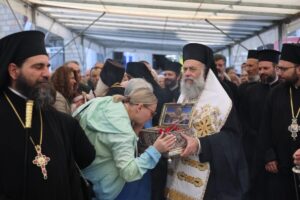«Όλοι μας ευχαριστούμε τον Άγιο Θεό, πάντα, για όλα εκείνα που γνωρίζουμε και εκείνα που δεν γνωρίζουμε, γιατί τα αισθητά, αντιληπτά και χειροπιαστά στοιχεία όπως η Τιμία Ζώνη της Παναγίας μας, τα λείψανα των Αγίων μας, είναι πάντα δίπλα μας, πάντα κοντά μας, είναι οι γιατροί μας, οι θεραπευτές μας, οι ψυχοθεραπευτές μας αν θέλετε οι αληθινοί. Για αυτό ευχαριστούμε πάντα τον Άγιο Θεό μας, τον ευγνωμονούμε και τον παρακαλούμε να συνεχίζει παραβλέποντας τα λάθη και τις ανομίες τούτου του λαού, τις δικές μας δηλαδή, να στηρίζει όλους εμάς. Γέροντα ευχαριστίες για την τιμή που κάνατε σε εμάς να φέρετε τη Ζώνη της Παναγίας μας. Να είστε όλοι καλά».
