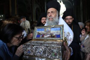 Με το “Χριστός Ανέστη” και υπό τη μεγάλη συγκίνηση του πιστού λαού που μέχρι την τελευταία ώρα έφτανε για να προσκυνήσει την Αγία Ζώνη, αναχώρησε από τον Ιερό Μητροπολιτικό Ναό των Αγίων Κωνσταντίνου και Ελένης Καρδίτσης το Ιερό Θεομητορικό Κειμήλιο, το μοναδικό που μας σώζεται από την επίγεια ζωή της Υπεραγίας Θεοτόκου.
