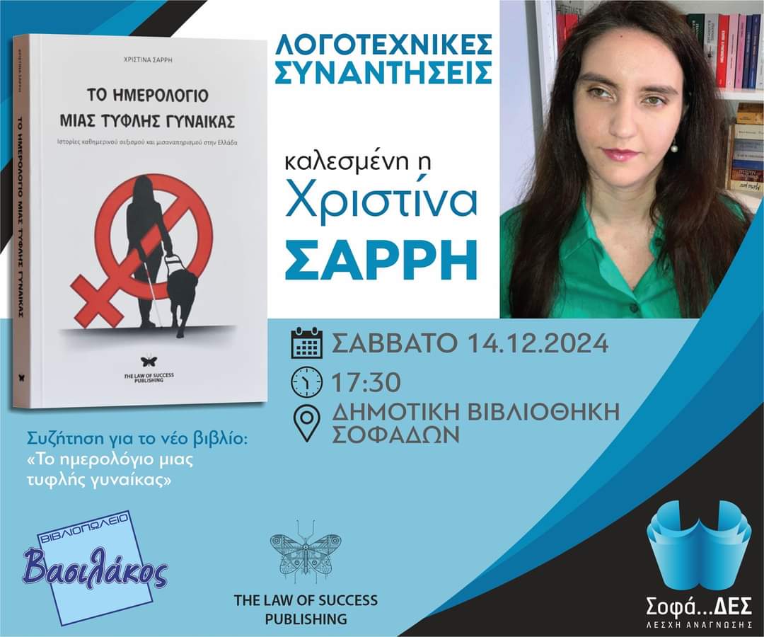 Το Σάββατο 14 Δεκεμβρίου 2024, στις 5:30μμ στον χώρο της Δημοτικής Σοφάδων, θα φιλοξενηθεί  η συγγραφέας κ. Χριστίνα Σαρρή, με το βιβλίο της με τίτλο ‘Το ημερολόγιο μιας τυφλής γυναίκας’.
