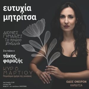 Η καλλιτέχνις, που ξεχωρίζει για την ερμηνευτική της δύναμη, την αυθεντικότητά της και την ευαίσθητη ματιά της, θα είναι καλεσμένη στην εκπομπή «Μεσημεριανό Μαγκαζίνο» (καθημερινά 13:00-14:00) με τη Βάσω Μπαλαμπάνη προκειμένου να μας μιλήσει για τη μουσική παράσταση με τίτλο «ΑΙΩΝΙΕΣ ΓΥΝΑΙΚΕΣ. Το πρώτο βλέμμα» που θα παρουσιάσει την Κυριακή 8 Μαρτίου (Παγκόσμια Ημέρα της Γυναίκας) στην Καρδίτσα, στον Πολυχώρο «Οδός Ονείρων».