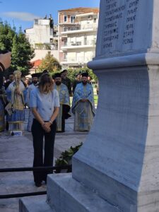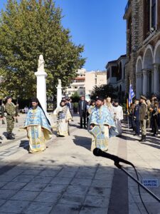 Στη συνέχεια, προέστη της επισήμου Δοξολογίας, η οποία εψάλη μετά το πέρας της Θείας Λειτουργίας, επί τη εθνική επετείω του ΟΧΙ και της επιμνημοσύνου δεήσεως, που έλαβε χώρα στο Ηρώο των πεσόντων στον προαύλιο χώρο του ως άνω Ιερού Μητροπολιτικού Ναού. Έπειτα παρακολούθησε την καθιερωμένη μαθητική και στρατιωτική παρέλαση της πόλεώς μας.