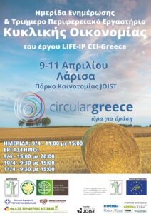 Το Πράσινο Ταμείο, το Υπουργείο Περιβάλλοντος και Ενέργειας (ΥΠΕΝ), η Περιφέρεια Θεσσαλίας, ο Δήμος Λαρισαίων, ο Φορέας Διαχείρισης Στερεών Αποβλήτων (Φο.Δ.Σ.Α.) της Περιφέρειας Θεσσαλίας Α.Ε. και η Οικολογική Εταιρεία Ανακύκλωσης (ΟΕΑ), συνδιοργανώνουν «Ημερίδα Ενημέρωσης και Περιφερειακό Εργαστήριο Κυκλικής Οικονομίας», από τις 9 έως και τις 11 Απριλίου 2025, στη Λάρισα, στο Πάρκο Καινοτομίας JOIST (Βαλτετσίου & Τριπόλεως, ΤΚ 41336), στο πλαίσιο του Έργου LIFE-IP CEI-Greece [1] – LIFE18 IPE/GR/000013 «Εφαρμογή της Κυκλικής Οικονομίας στην Ελλάδα».