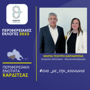 Την Ιστορικό Πολιτισμού – Μουσειοπαιδαγωγό Μαρία Τσουρή – Καραμπινά που κατέρχεται υποψήφια περιφερειακή σύμβουλος στην Π.Ε. Καρδίτσας στις αυτοδιοικητικές εκλογές του Οκτωβρίου, καλωσόρισε ο Περιφερειάρχης Θεσσαλίας Κώστας Αγοραστός στον συνδυασμό «Συμμαχία υπέρ των πολιτών» που έχει σταθερά στο επίκεντρο τον άνθρωπο, αγωνίζεται με έργα, δράσεις, πρωτοβουλίες για μια Περιφέρεια χωρίς διακρίσεις και αποκλεισμούς. Ένα με τον Πολιτισμό.