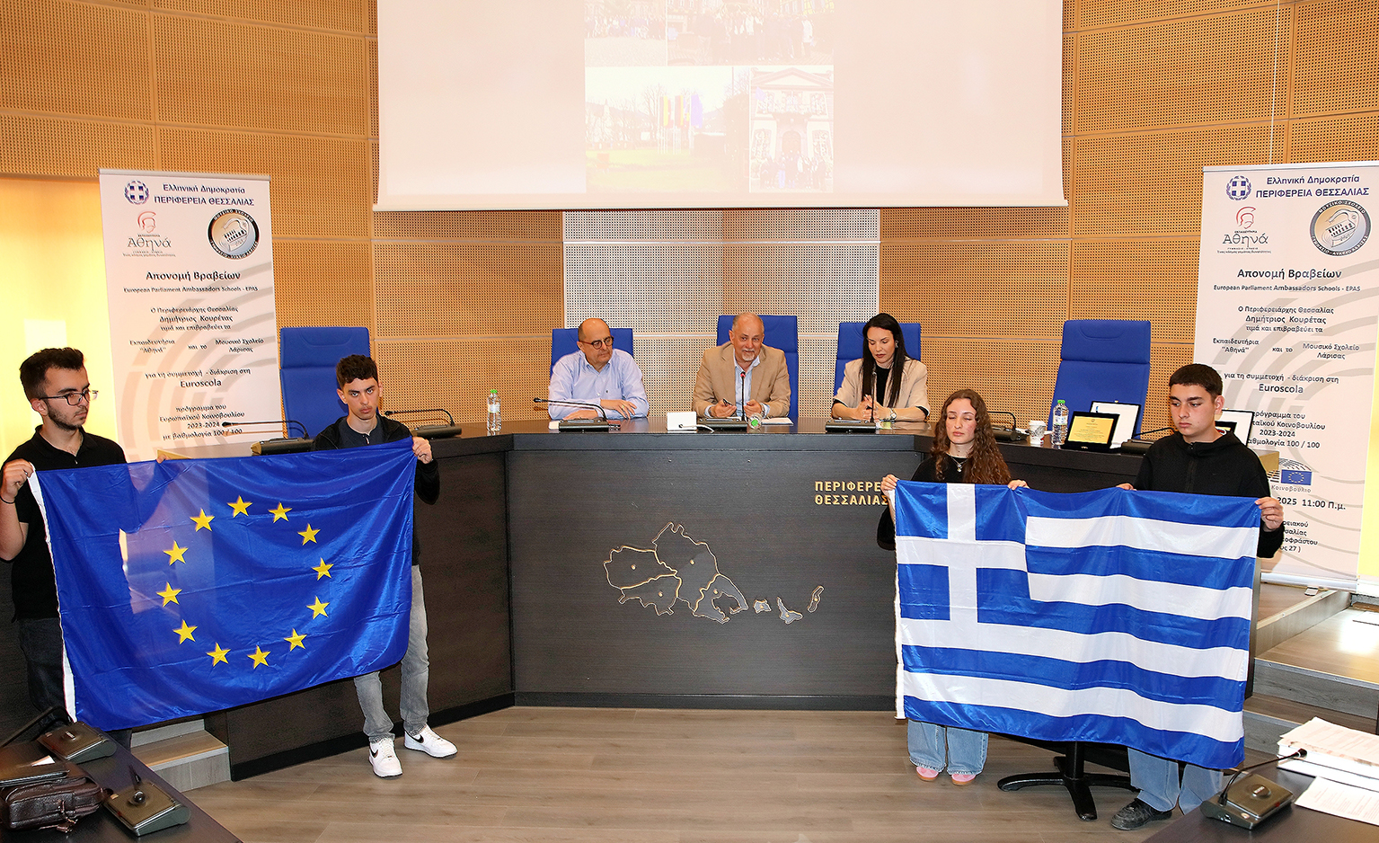 Τη διάκριση της νέας γενιάς στην Ευρώπη γιόρτασε η Περιφέρεια Θεσσαλίας, σε ειδική εκδήλωση που πραγματοποιήθηκε σήμερα το πρωί, στην Αίθουσα του Περιφερειακού Συμβουλίου. Το Μουσικό Σχολείο Λάρισας και τα Εκπαιδευτήρια «Αθηνά» απέσπασαν την ανώτατη βαθμολογία 100/100 στο ευρωπαϊκό πρόγραμμα «Σχολεία-Πρέσβεις του Ευρωπαϊκού Κοινοβουλίου» (European Parliament Ambassador Schools – EPAS) στο πλαίσιο του προγράμματος Euroscola, για το σχολικό έτος 2023-2024.