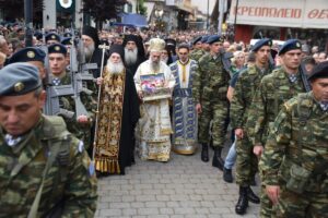 Άγημα του Κέντρου Εκπαίδευσης Στρατονομίας απέδωσε τιμές και η φιλαρμονική του Δήμου Καρδίτσας παιάνιζε χαρμόσυνα. Οι πιστοί με δάκρυα στα μάτια έραιναν με ροδοπέταλα την πομπή που σχηματίστηκε και η οποία σταμάτησε αρχικά στην κεντρική πλατεία. Στη συνέχεια μέσω του πεζοδρόμου κατέληξε στον Ιερό Μητροπολιτικό Ναό των Αγίων Κωνσταντίνου και Ελένης όπου τελέσθηκε η Ακολουθία του Όρθρου και Θεία Λειτουργία.
