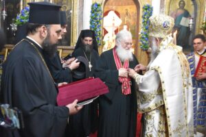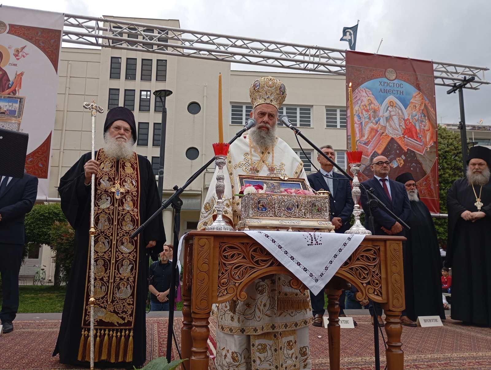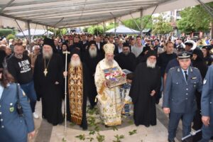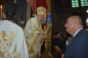 Πρόξενος ὅλης αὐτῆς τῆς χαρᾶς καί ἀγαλιάσεως, ἀλλά καί κομιστῆς τῶν εὐλογιῶν στόν τόπο μας τυγχάνετε ἐσεῖς Πανοσιολογιώτατε ἅγιε Καθηγούμενε, ὅπου σήμερα «ἀγαλλομένῳ ποδί» προσήλθατε λαμπροφόρος μέ τούς περί ὑμᾶς, γιά νά μᾶς φέρετε τήν εὐλογίαν, τήν χάριν, τόν ἁγιασμόν. Ὁμολογοῦμεν τήν χάριν καί κηρύττομεν τήν ἀγάπην καί τό πνευματικόν σας ἐνδιαφέρον τό ὁποῖον εἶναι καί πρός τούς ἐγγύς καί πρός τούς μακράν, πρός τούς σταθερούς καί ἀγωνιστάς εἰς τήν πίστιν καί πρός τούς ἀδυνάτους πρός ἐνίσχυσιν πνευματικήν, πρός τούς πάσχοντας καί πρός τούς ἐν ἀνάγκῃ ὄντας ἀδελφούς, πρός τούς οἰκογενειάρχας πολυτέκνους, τούς ὁποίους ποικιλοτρόπως ἐνδυναμώνετε καί ἑδραιώνετε, καί εἰς τήν Ἱεράν Μητρόπολιν μας ὅπως καί σέ ἄλλες Ἱερές Μητροπόλεις, ἐπιτελῶντας τό μυστήριο τῆς σωτηρίας τῆς ἑλληνικῆς οἰκογενείας.