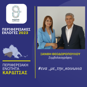 Την συμβολαιογράφο Ξανθή Θεοδωροπούλου που κατέρχεται υποψήφια περιφερειακή σύμβουλος στην Π.Ε. Καρδίτσας στις αυτοδιοικητικές εκλογές του Οκτωβρίου, καλωσόρισε ο Περιφερειάρχης Θεσσαλίας Κώστας Αγοραστός στον συνδυασμό «Συμμαχία υπέρ των πολιτών» που έχει σταθερά στο επίκεντρο τον άνθρωπο και αγωνίζεται με έργα, δράσεις, πρωτοβουλίες για μια Περιφέρεια χωρίς διακρίσεις και αποκλεισμούς.