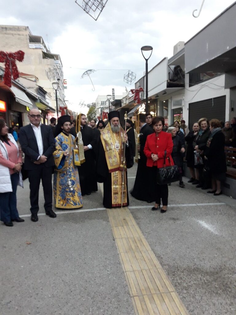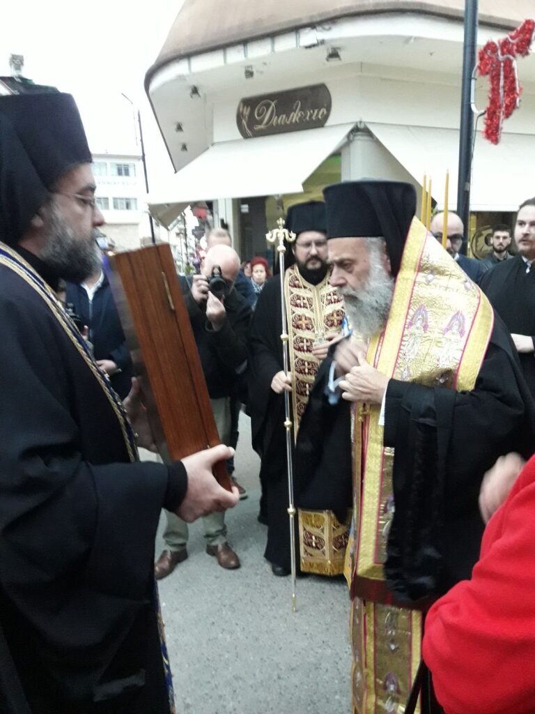 Η υποδοχή έγινε στην διασταύρωση των οδών Καραϊσκάκη και Μπλατσούκα υπό του Σεβασμιωτάτου Μητροπολίτου μας κ. Τιμοθέου, του Ιερού κλήρου, αρχών του τόπου και πλήθος πιστών.