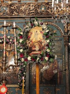 Όταν εισερχόμαστε στον ναό της Παναγίας, γινόμαστε Εκκλησία. Εκκλησία ζώσα, όπως αποκαλούμε και τους ναούς μας: Εκκλησίες. Συγκεντρωνόμαστε εκεί για να υμνήσουμε, να δοξολογήσουμε και να ευχαριστήσουμε τον Κύριό μας Ιησού Χριστό, την Παναγία Μητέρα Του και τους Αγίους της πίστεώς μας. Εκείνη, επάνω στην κόγχη του Ιερού Βήματος – η Πλατυτέρα των Ουρανών μας σκεπάζει και μας επιβεβαιώνει την υψηλή Της παρουσία στη ζωή μας. Εφόσον κι εμείς την επιθυμούμε. Γι’ αυτό, μέσα στον ναό Της, εισερχόμαστε μετά φόβου και τρόμου. Αφήνουμε τον εαυτό μας, τον χαμερπή, έξω από την έξω από την πόρτα του ναού και εισερχόμαστε αστράπτοντες και λάμποντες ηλιομένοι.