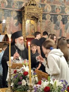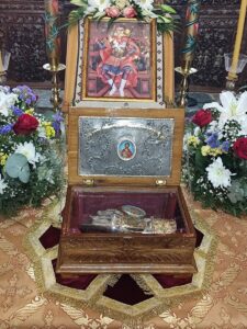 Η Ιερή Ακολουθία περιέλαβε και την προσκύνηση του αποτμήματος του ιερού λειψάνου του Αγίου Νικολάου του εν Βουναίνη, ο οποίος είναι προστάτης των νέων της Μητροπόλεώς μας.