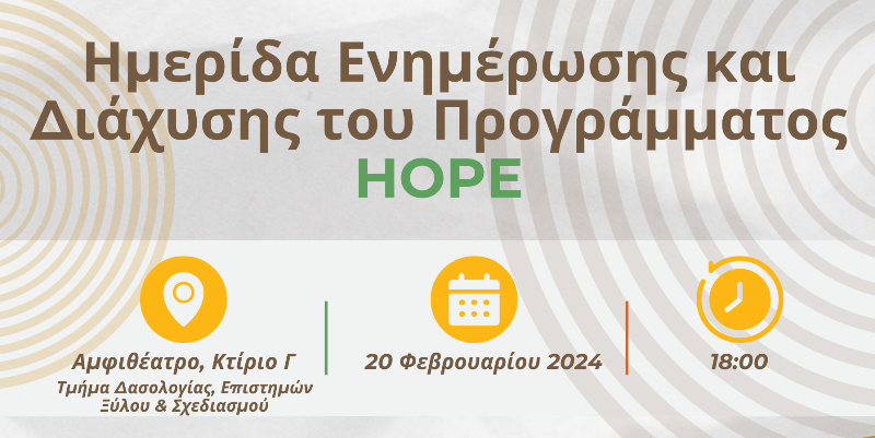 Το Ινστιτούτο Ξύλου, Επίπλου & Ξύλινης Συσκευασίας σας προσκαλεί στην Ημερίδα Ενημέρωσης και Διάχυσης του Προγράμματος HOPE, η οποία θα πραγματοποιηθεί την: Τρίτη 20 Φεβρουαρίου 2024 και ώρα 18:00, στο Αμφιθέατρο του Κτιρίου Γ του Τμήματος Δασολογίας, Επιστημών Ξύλου & Σχεδιασμού.