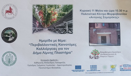 Ο Δήμος Λίμνης Πλαστήρα, σε συνεργασία με το Πανεπιστήμιο Θεσσαλίας, το θεσμοθετημένο Εργαστήριο Δενδροκηπευτικών και Εδαφικών Πόρων “Hortab”, οργανώνουν Ημερίδα για τις Περιβαλλοντικές Καινοτόμες Καλλιέργειες για τους παραγωγούς της περιοχής. Η εκδήλωση θα πραγματοποιηθεί την Κυριακή πρωϊ, 11 Μαϊου και ώρα 10.30 π.μ. στο Μορφοβούνι, στην αίθουσα του Πολιτιστικού Κέντρου Αντ. Σαμαράκης.