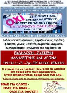 Καλούμε εκπαιδευτικούς, εργαζόμενους, αγρότες, φοιτητές, γονείς, μαθητές, σωματεία, σχήματα, συλλογικότητες, αγωνιστές της Καρδίτσας σε ΕΚΔΗΛΩΣΗ-ΣΥΣΚΕΨΗ ΑΛΛΗΛΕΓΓΥΗΣ ΚΑΙ ΑΓΩΝΑ την ΤΡΙΤΗ 11/3 στις 7μμ στο ΕΡΓΑΤΙΚΟ ΚΕΝΤΡΟ