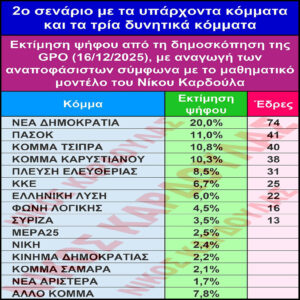 Στις 16/12/2025 η GPO δημοσίευσε και το Β΄ μέρος της έρευνάς της, όπου υπήρχε η ερώτηση: «Πόσο πιθανό είναι να ψηφίσετε τα υπάρχοντα κόμματα και τα τρία δυνητικά κόμματα Τσίπρα, Καρυστιανού και Σαμαρά» και οι απαντήσεις ήταν «Πολύ πιθανό» και «Αρκετά πιθανό».