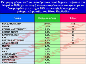 - Αν είχαμε σήμερα εκλογές θα είχαμε 8κομματική Βουλή και η ΝΔ θα είχε 114 έδρες, το ΠΑΣΟΚ 39, το κόμμα Καρυστιανού 32, το κόμμα Τσίπρα 31, η Ελληνική Λύση 23, το ΚΚΕ 22, η Πλεύση Ελευθερίας 21 και η Φωνή Λογικής 18έδρες.