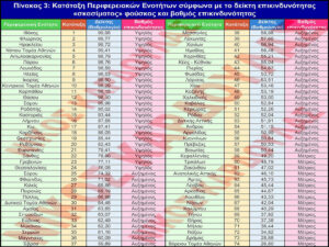 Λαμβάνοντας υπόψη τις πέντε παραμέτρους που αναφέρθηκαν καθώς και την παράμετρο μείωσης των πωλήσεων κατοικιών το 2025 σε σχέση με το 2024 από το 1ο μέρος της έρευνας, χρησιμοποιήθηκε η μέθοδοςτης Περιβάλλουσας Ανάλυσης Δεδομένων (DataEnvelopmentAnalysis), η οποία αποτελεί ένα σημαντικό εργαλείο λήψης αποφάσεων, για την ανάλυση των δεδομένων.Για τη συγκεκριμένη μέθοδο εφαρμόσθηκε ο αλγόριθμος MaxDEA στις έξι παραπάνω παραμέτρους και υπολογίσθηκαν ο δείκτης επικινδυνότητας φούσκας (βαθμολογία) και η κατάταξη των ΠΕ ανάλογα με το δείκτη και τα αποτελέσματα απεικονίζονται στον παρακάτω πίνακα 3.