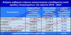 Λαμβάνοντας από την ΑΑΔΕ επίσημα στοιχεία των φορολογικών δηλώσεων των ετών 2019 και 2024, συντάχθηκε ο παρακάτω πίνακας, όπου απεικονίζονται κατά ομάδες επαγγελμάτων το ετήσιο καθαρό οικογενειακό εισόδημα των φορολογικών δηλώσεων 2019 και 2024, η αντίστοιχη αύξηση την εξαετία 2019 – 2024 και ο σωρευτικός πληθωρισμός μεταξύ των ετών 2019 και 2024.