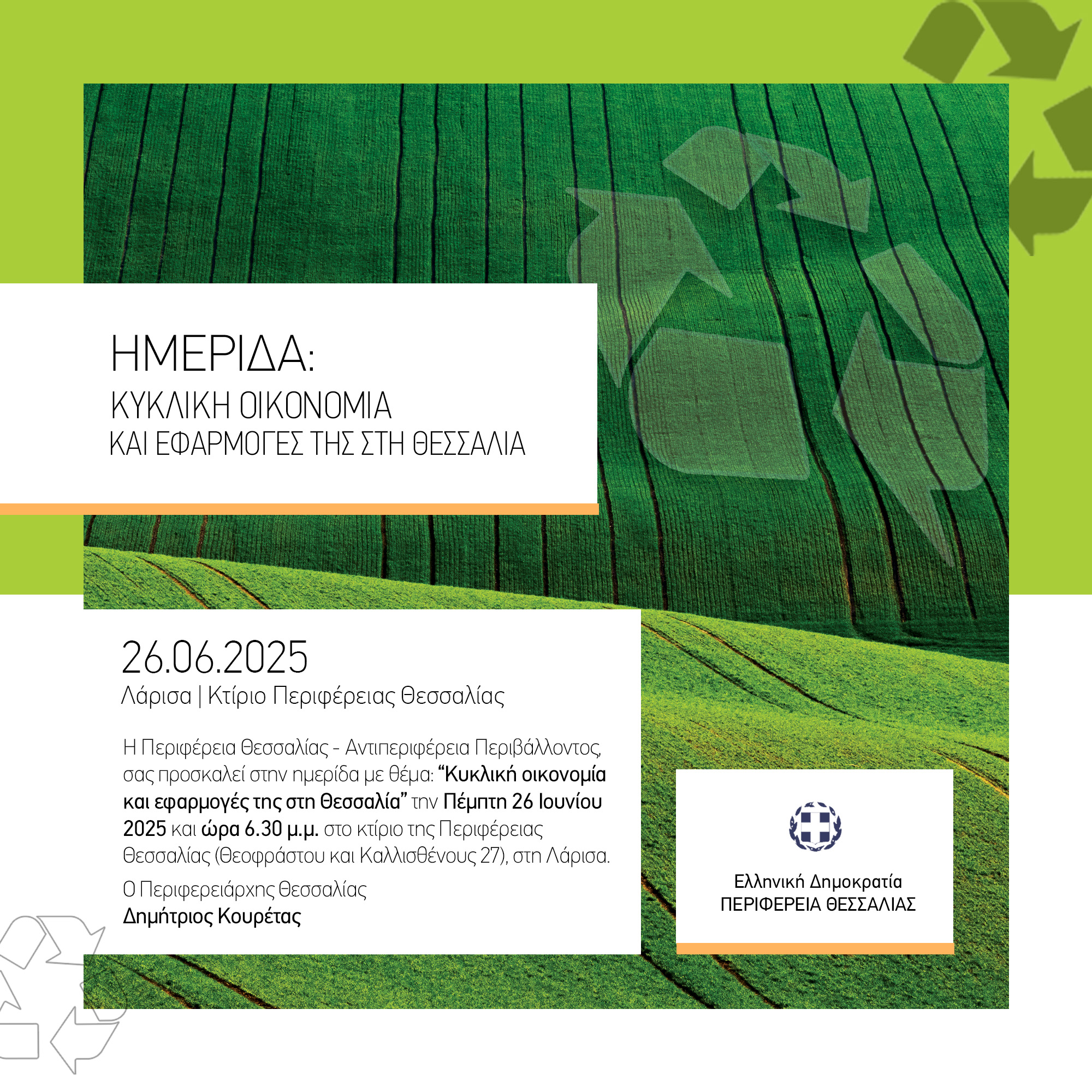 Η Περιφέρεια Θεσσαλίας διοργανώνει μία σημαντική εσπερίδα με θέμα «Κυκλική Οικονομία- Εφαρμογές στη Θεσσαλία», στο πλαίσιο των περιβαλλοντικών δράσεων που υλοποιεί καθ’ όλη τη διάρκεια του έτους.