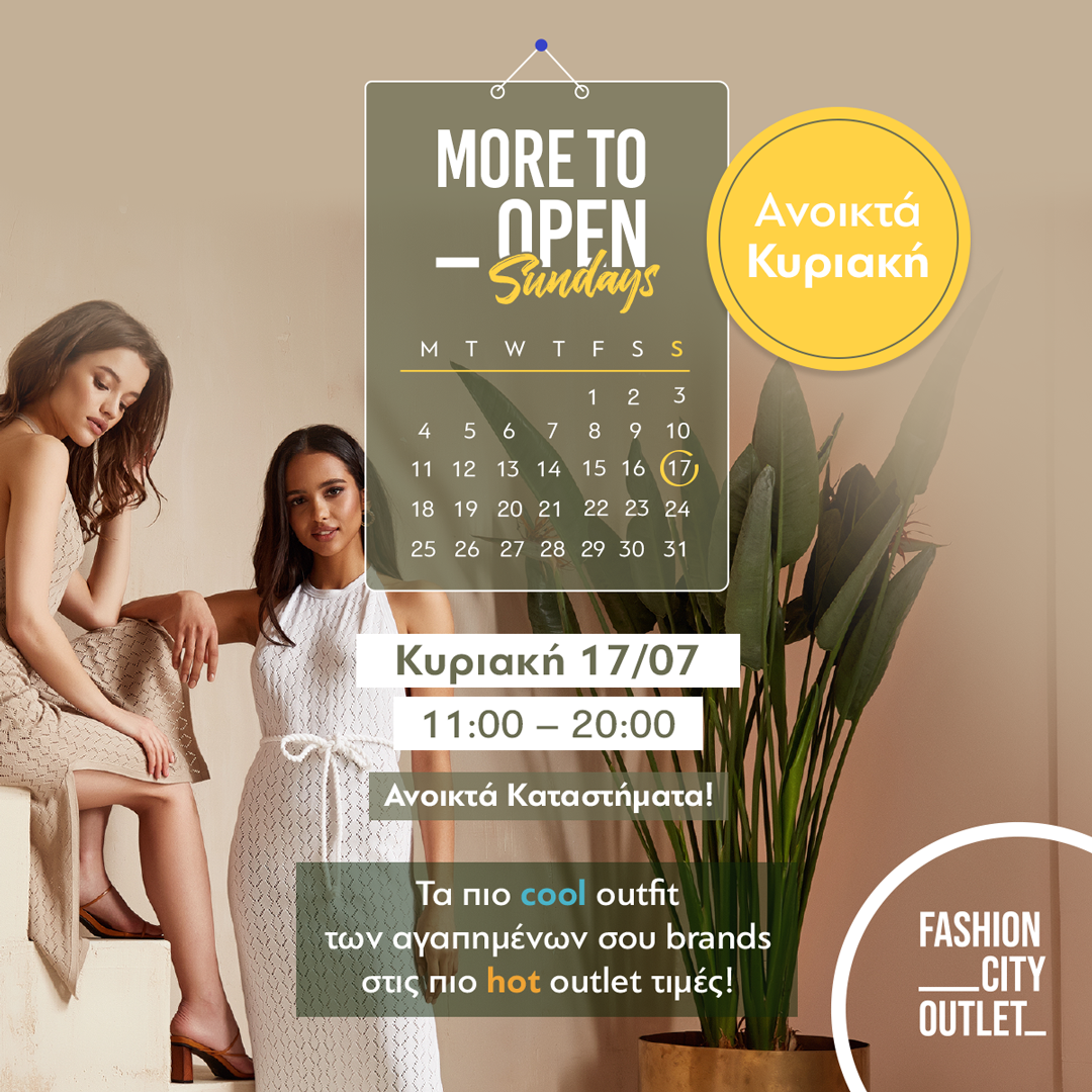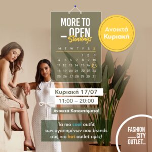 Την προσεχή Κυριακή 17/7 τα καταστήματα του FashionCityOutlet θα είναι ανοιχτά από τις 11 το πρωί έως και τις 8 το βράδυ, λόγω της 1ης Κυριακής των Καλοκαιρινών Εκπτώσεων.