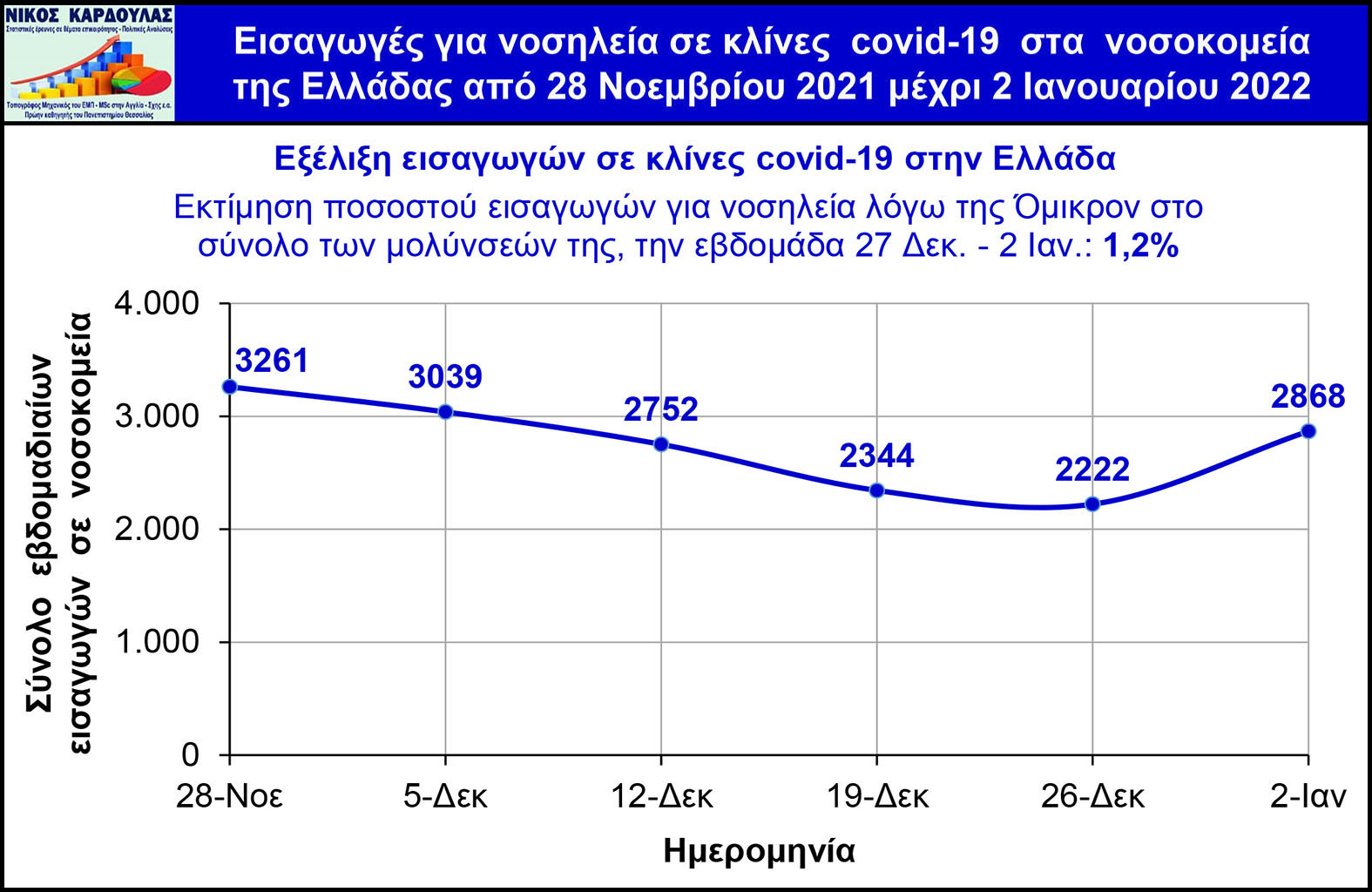 Η νέα μετάλλαξη Όμικρον κυριαρχεί στο 76% των μολύνσεων κορωνοϊού στην επικράτεια και στο 83% των μολύνσεων στην Αττική, αλλά οι εισαγωγές για νοσηλεία στα νοσοκομεία λόγω της Όμικρον ήταν μόλις 1,2% επί των συνολικών μολύνσεών της μέχρι τις 2 Ιανουαρίου 2022, σύμφωνα με προσομοίωση του μαθηματικού μου μοντέλου.