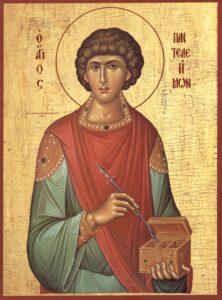 Ο Άγιος Παντελεήμων (Παντελέων το πρότερον όνομα) καταγόταν από τη Νικομήδεια της Μικράς Ασίας και έζησε στα χρόνια του Μαξιμιανού (286 – 305 μ.Χ.). Πατέρας του ήταν ο Ευστόργιος, ο οποίος ήταν εθνικός και μετά τις νουθεσίες του γιου του έγινε χριστιανός. Μητέρα του ήταν η Ευβούλη, η οποία προερχόταν από χριστιανική οικογένεια. Εκπαιδεύτηκε στην ιατρική από τον Ευφρόσυνο και κατηχήθηκε στη χριστιανική πίστη και βαπτίσθηκε από τον πρεσβύτερο Ερμόλαο, που ήταν ιερέας της Εκκλησίας της Νικομήδειας.