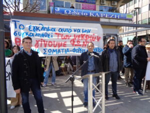 Μεταξύ άλλων, μίλησαν οι Πρόεδροι του Εργατικού Κέντρου και του Νομαρχιακού Τμήματος της ΑΔΕΔΥ Γιώργος Καπράνας και Απόστολος Ταξιάρχης αντίστοιχα.