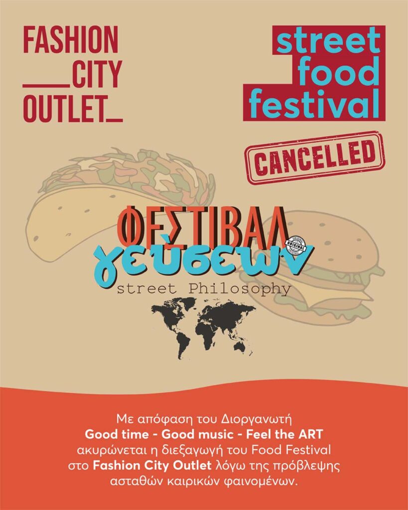 Το Food Festival,«ΦΕΣΤΙΒΑΛ γεύσεων, street Philosophy» η γευστική εμπειρία που είχε προγραμματιστεί στο Fashion City Outlet για το τετραήμερο 14 έως 17 Μαΐου δεν θα πραγματοποιηθεί.