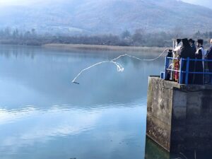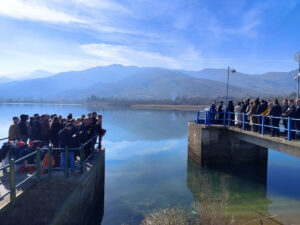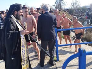Ακολούθησε η τελετή του αγιασμού των υδάτων και της κατάδυσης του Τιμίου Σταυρού στην αναρρυθμιστική λίμνη, από την οποία ο Σεβασμιώτατος, έριξε στο νερό τον Τίμιο Σταυρό, τον οποίο έσπευσαν να ανασύρουν δέκα κολυμβητές.