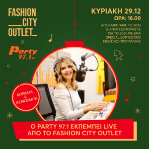 Με μουσική, τραγούδι και χορό το Fashion City Outlet ετοιμάζεται να αποχαιρετίσει το 2024 και να υποδεχθεί το 2025 το Σάββατο 28 και την Κυριακή 29 Δεκεμβρίου 2024!