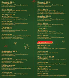 Κι όλα αυτά ενώ οι παιδικές εκδηλώσεις συνεχίζονται και «ξετρελαίνουν» τα παιδιά έως τις 4/1 από τις 12.00 έως τις 14.00 & από τις 17.00 έως τις 20.00