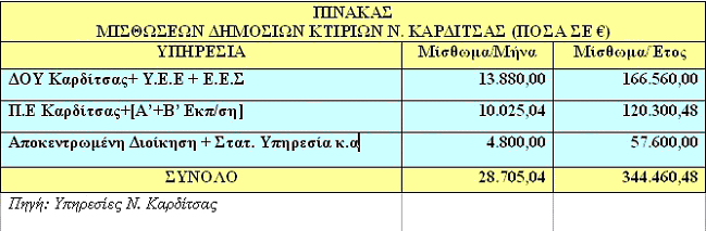 Στη πόλη της Καρδίτσας βρίσκονται διάσπαρτες υπηρεσίες που στεγάζονται ακροβολισμένες σε διάφορα κτίρια- κυρίως μισθωμένα- για τα οποία καταβάλλονται, διόλου ευκαταφρόνητα ποσά ενοικίων δεκάδων χιλιάδων ευρώ κάθε χρόνο (βλπ σχετικό Πίνακα). Τα κτίρια αυτά επιβαρύνουν σημαντικά τους προϋπολογισμούς του κράτους και των αυτοδιοικήσεων, χωρίς κανέναν να προβληματίζει. Όμως δεν ζούμε στην εποχή της ευμάρειας και των εύκολων λύσεων που μας «βομβάρδιζε» το «καλοταϊσμένο» πολιτικό σύστημα Οι καιροί έχουν αλλάξει και όσο πιο γρήγορα το καταλάβουμε, τόσο το καλύτερο για όλους μας.