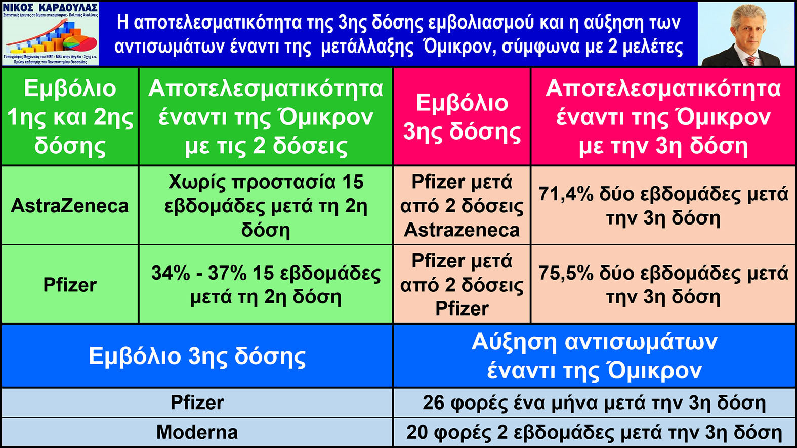 Σύμφωνα με τη μελέτη (https://khub.net/documents/135939561/430986542/Effectiveness+of+COVID-19+vaccines+against+Omicron+variant+of+concern.pdf/f423c9f4-91cb-0274-c8c5-70e8fad50074), η αποτελεσματικότητα των εμβολίων έναντι των μεταλλάξεων Όμικρον και Δέλτα, μετά τη 2η δόση και μετά την 3η δόση, για όσους έκαναν τις δύο πρώτες δόσεις με τα εμβόλια Astrazeneca ή Pfizer και την 3η δόση με το Pfizer, τα συμπεράσματα της μελέτης είναι: