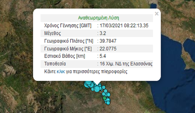 Νέος μετασεισμός σημειώθηκε το πρωί της Τετάρτης, και συγκεκριμένα στις 10:22, στην Ελασσόνα που δοκιμάζεται εδώ και ένα δεκαπενθήμερο περίπου.