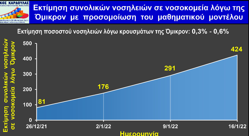 - Μέχρι τις 16 Ιανουαρίου 2022 εκτιμήθηκε ότι θα χρειασθούν νοσηλεία σε νοσοκομείο 424 άτομα που μολύνθηκαν με την Όμικρον, που σημαίνει ότι η Όμικρον δεν θα δημιουργήσει μεγάλα προβλήματα στη νοσοκομειακή περίθαλψη.