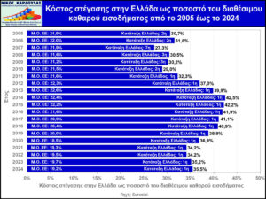☑Το κόστος στέγασης για το μέσο ελληνικό νοικοκυριόσανποσοστό του διαθέσιμου καθαρού εισοδήματοςείναι το υψηλότερο ποσοστό μεταξύ των 27 χωρών της ΕΕ από το 2011 και μετά.