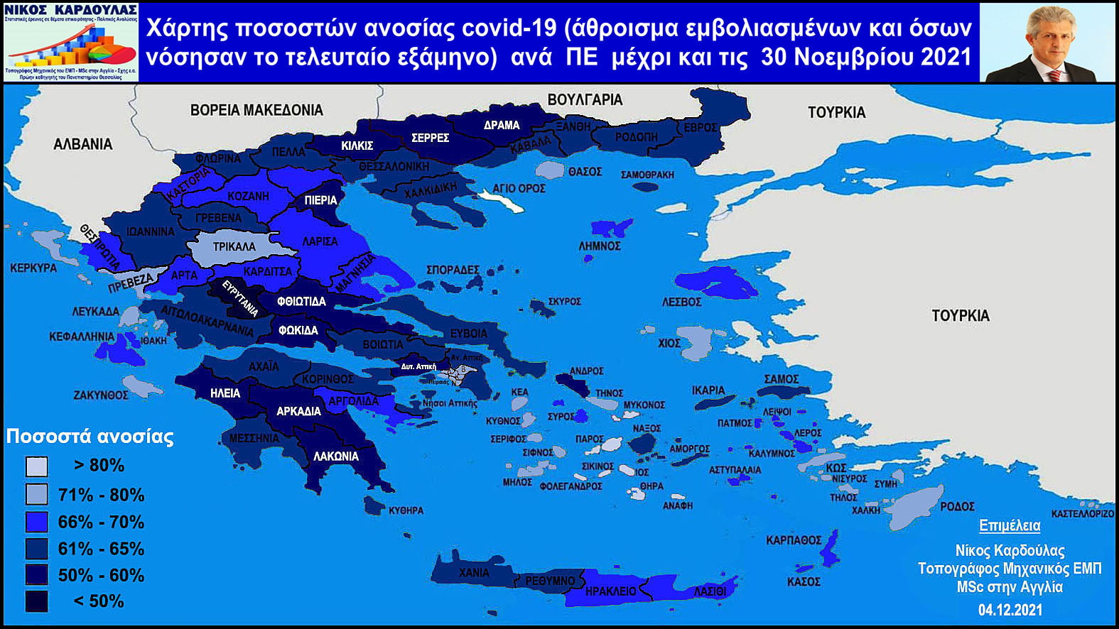 Μέχρι και τις 30 Νοεμβρίου 2021, 3 Περιφερειακές Ενότητες (ΠΕ) της χώρας είχαν ποσοστό ανοσίας πάνω από 80%, 17 ΠΕ ποσοστό ανοσίας από 71% έως 80%, 18 ΠΕ ποσοστό ανοσίας από 66% έως 70%, 24 ΠΕ ποσοστό ανοσίας από 61% έως 65%, 11 ΠΕ ποσοστό ανοσίας από 50% έως 60% και μία ΠΕ ποσοστό ανοσίας κάτω από 50%.