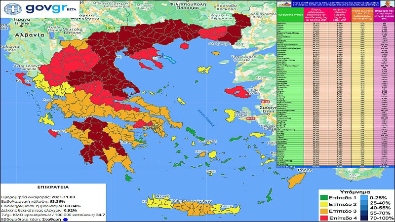 Αποτυπώνονται τα ποσοστά των πλήρως εμβολιασμένων μέχρι και τις 3 Νοεμβρίουστις Περιφερειακές Ενότητες (ΠΕ) της χώρας, σύμφωνα με τον τόπο διαμονήςκαι όχι ανά εμβολιαστικό κέντρο, όπως αυτά δημοσιεύθηκαν από την Ελληνική Κυβέρνηση στις 4 Νοεμβρίου 2021 στον αντίστοιχο επιδημιολογικό χάρτη. Στον πίνακα αναφέρονται επίσης και όσοι νόσησαν το τελευταίο εξάμηνο ανά ΠΕ σύμφωνα με στοιχεία του ΕΟΔΥ, το ποσοστό ανοσίας ανά ΠΕ μέχρι και τις 3 Νοεμβρίου 2021 (πλήρως εμβολιασμένοι και νοσήσαντες) και πόσοι ακόμα θα πρέπει να εμβολιασθούν ή νοσήσουν ανά ΠΕ, ώστε να επιτευχθεί το ποσοστό ανοσίας 90% και να αρχίσει έτσι η ενδημική φάση του ιού και το τέλος της πανδημίας.