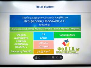Επίσης, συζητήθηκαν τα δεδομένα που υπάρχουν σε επίπεδο Θεσσαλίας με βάση τα έργα που εξελίσσονται, τον προγραμματισμό με βάση τις υποχρεώσεις για το περιβάλλον και ένα γενικότερο πεδίο θεμάτων σε σχέση με την πορεία του ΦοΔΣΑ και τις υπάρχουσες ιδιαιτερότητες ανά περιοχή (νησιωτικότητα, ορεινότητα).