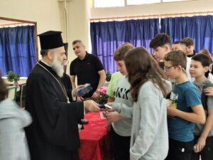 Ανέφερε επίσης ότι το σχολείο είναι ένας χώρος γνώσεων και επικοινωνίας. Μέσα από αυτό θα μπορέσουν να διαμορφώσουν τον χαρακτήρα τους και να πάρουν εφόδια στη ζωή τους. Προσφέρει εκτός από την γνώση, μεθόδους κοινωνικοποίησης, άμιλλα και πολλά χαρίσματα. Και αυτά τα χαρίσματα, η Εκκλησία τα ονομάζει τάλαντα. Να έχουν «τάλαντα», να είναι χαρισματικοί άνθρωποι. Να μάθουν να ζουν ο ένας με τον άλλον και να αγαπούν τους συνανθρώπους τους, ας έχουν αδυναμίες. Όλοι άλλωστε έχουν αδυναμίες. Να φροντίζουν τους εαυτούς τους και τους συνοδοιπόρους τους που περπατάνε μαζί τους σ’ αυτή τη ζωή.
