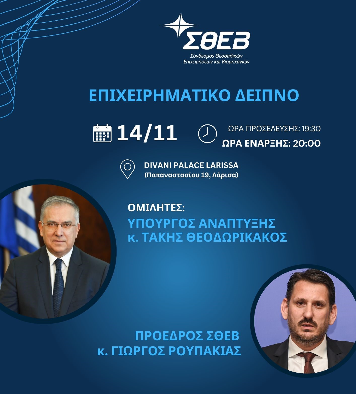 Ο Υπουργός Ανάπτυξης κ. Τάκης Θεοδωρικάκος θα είναι ο επίσημος προσκεκλημένος στο καθιερωμένο επιχειρηματικό δείπνο που διοργανώνει ο ΣΘΕΒ για τις επιχειρήσεις – μέλη του, την Πέμπτη 14 Νοεμβρίου και ώρα 19.30 στη Λάρισα, στο ξενοδοχείο Divani Palace.
