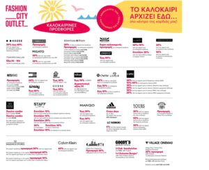 Οι καλοκαιρινές προσφορές στο Fashion City Outlet ξεκίνησαν και δεν μπορούν να αφήσουν κανέναν αδιάφορο! Όλα τα επώνυμα brands των καταστημάτων που λειτουργούν στο «εμπορικό κέντρο της καρδιάς μας», προσφέρονται σε εξαιρετικές τιμές και τα καθιστούν προσιτά στον μέσο καταναλωτή.