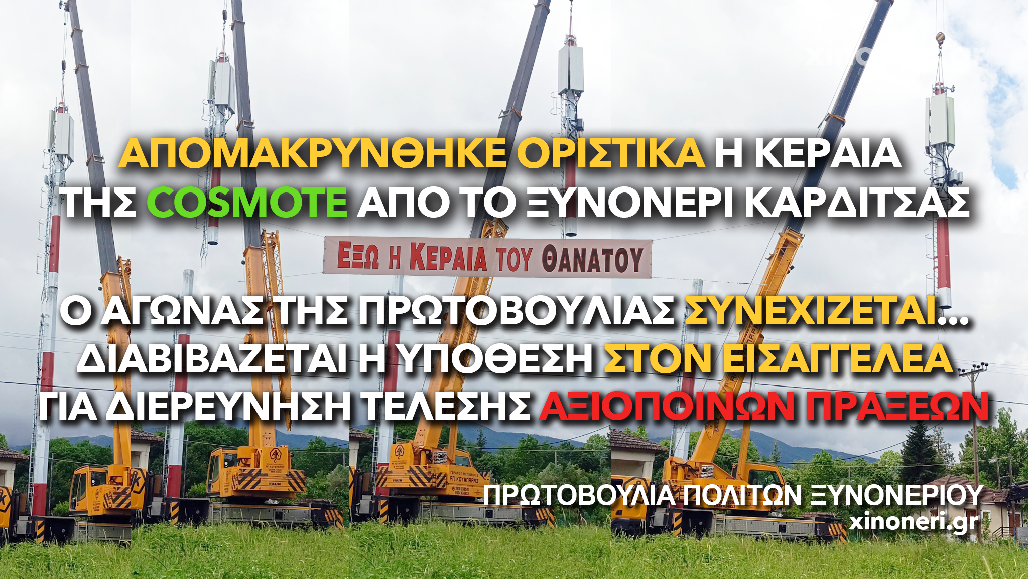 Σήμερα με την οριστική απομάκρυνση της κεραίας, έχοντας τηρήσει μέχρι κεραίας τις υποσχέσεις μας, δηλώνουμε ότι ο αγώνας δεν σταματά εδώ:παραμένουμε σε εγρήγορση και παρακολουθούμε στενά τις εξελίξεις των ερευνών του Εισαγγελέα αναφορικά στην τέλεση αξιόποινων πράξεων σχετικά με την υπόθεση, ζήτημα για το οποίο θα σας κρατούμε ενήμερους. Αντίστοιχη διερεύνηση διοικητικά αξιόποινων πράξεων σε φορείς που εμπλέκονται με την εν λόγω «αδειοδότηση» της εγκατάστασης πρέπει να γίνει και σε πολιτικό επίπεδο και αναμένουμε για αρχή από τους αιρετούς της Τοπικής Κοινότητας Ξυνονερίου και του Δήμου Καρδίτσας να πράξουν τα δέοντα.